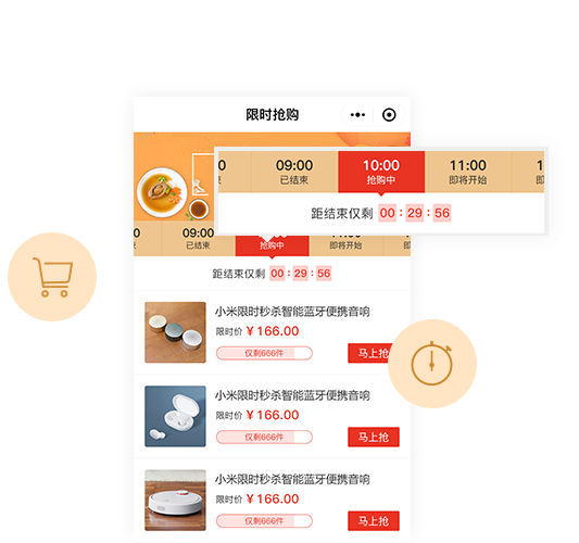 限时秒杀,获客成单日常营销爆款商品,限时限量秒杀,制造紧张氛围,刺激客户产生强烈购买欲望,带来流量的高转化。